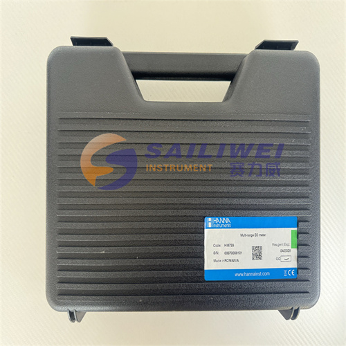 hi8733主机,hi76302w 内置温度传感器的四环电导率-ec电极,电导率标准缓冲液(标准值@25°c:12880 μs/cm ,规格:20ml),中英文使用说明书,hi721015 定制专用仪器包装盒